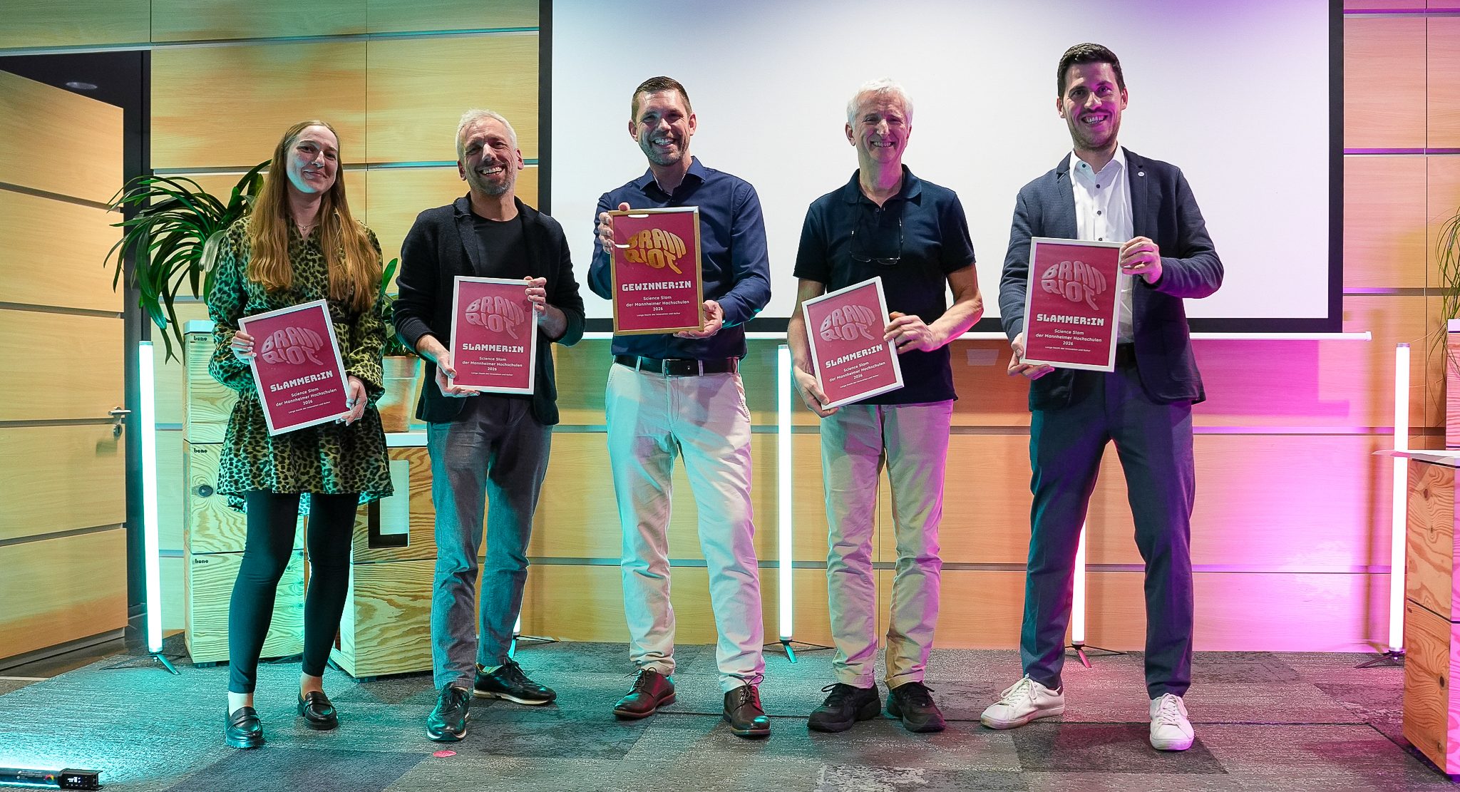Dass dieser Austausch nicht nur kompakte wissenschaftliche Substanz, sondern auch jede Menge Spaß enthalten kann, bewiesen die fünf Slammerinnen des ScienceSlams BRAIN R!OT vor rund 160 Besucherinnen und Besuchern. Die Slammer – vier gestandene „Prof. Dr.“ der TH Mannheim – und eine Postdoc Reseacherin wagten sich aus dem „Elfenbeinturm der Wissenschaft“ heraus auf die Bühne unseres ScienceSlams.